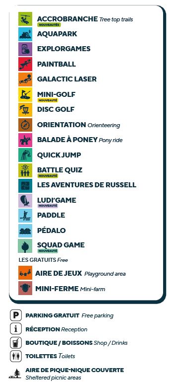 Découvrez nos activités : accrobranche, aquapark, paintball, Galactic laser, Explor game, Disc golf, parcours d’orientation, Quick jump, balades à poney, paddle, pédalo et les Grands Défis du Skipper.